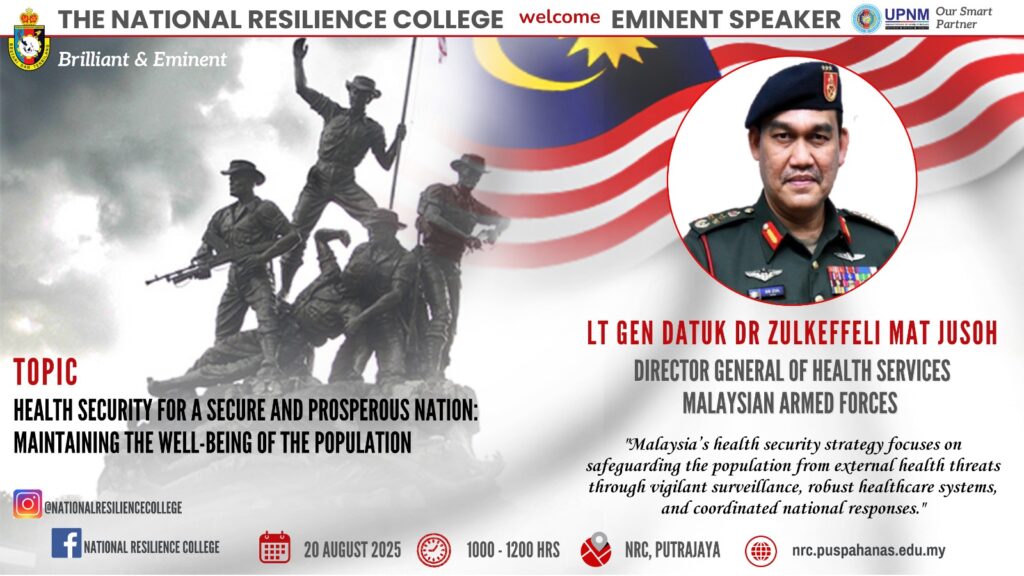 The National Resilience College successfully hosted an Eminent Speaker Session on 20 August 2025 featuring Lt Gen Dato’ Dr Zulkeffeli Mat Jusoh, Director General of Health Services, Malaysian Armed Forces. He shared valuable insights on “Health Security for a Secure and Prosperous Nation: Maintaining the Well-being of the Population”, emphasizing Malaysia’s commitment to safeguarding its […]