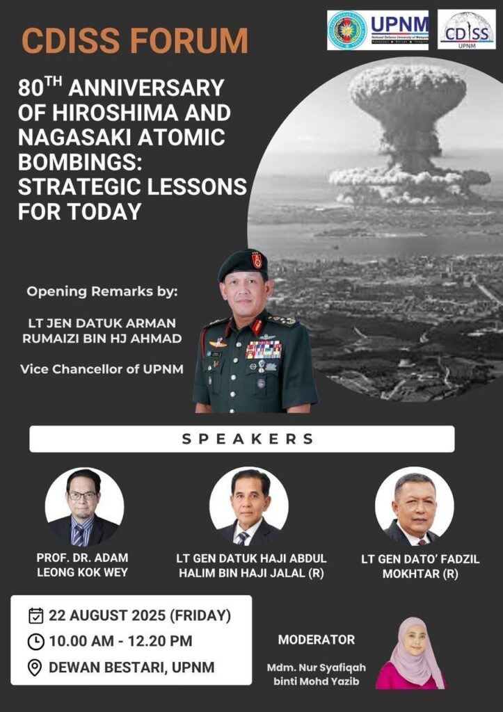 The National Resilience College (NRC) attended the forum organised by the Centre for Defence and International Security Studies (CDISS), Universiti Pertahanan Nasional Malaysia (UPNM) on “80th Anniversary of Hiroshima and Nagasaki Atomic Bombings: Strategic Lessons for Today.” With insights from Prof. Dr. Adam Leong Kok Wey, Lt Gen Datuk Haji Abdul Halim bin Haji Jalal […]