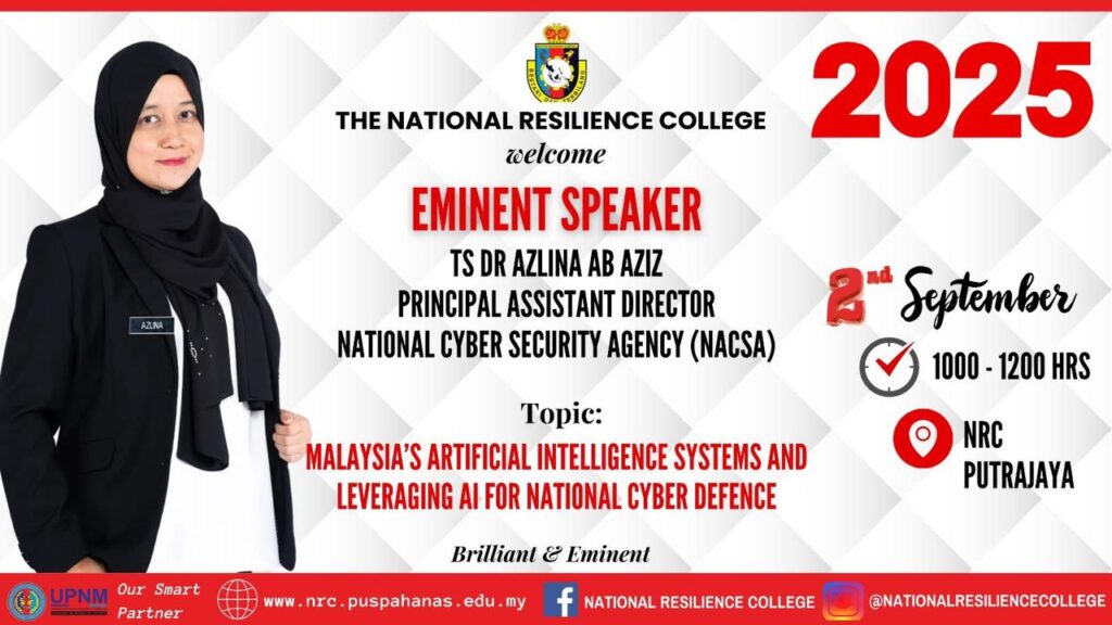 On September 2nd, The National Resilience College was honoured to host Ts Dr Azlina Ab Aziz, Principal Assistant Director at the National Cyber Security Agency (NACSA), as part of our Eminent Speaker Series. She delivered an insightful session on “Malaysia’s Artificial Intelligence Systems and Leveraging AI for National Cyber Defence.” This topic was crucial as […]