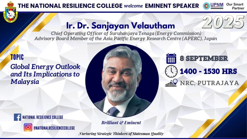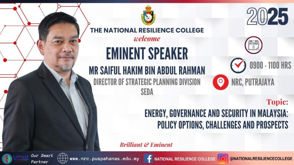 PUTRAJAYA, Monday, Sep 8 – The National Resilience College was honoured to welcome Mr. Saiful Hakim bin Abdul Rahman, Director of Strategic Planning Division, SEDA, as our next Eminent Speaker. He delivered an insightful session on “Energy, Governance and Security in Malaysia: Policy Options, Challenges and Prospects”, a topic of great national importance as Malaysia […]