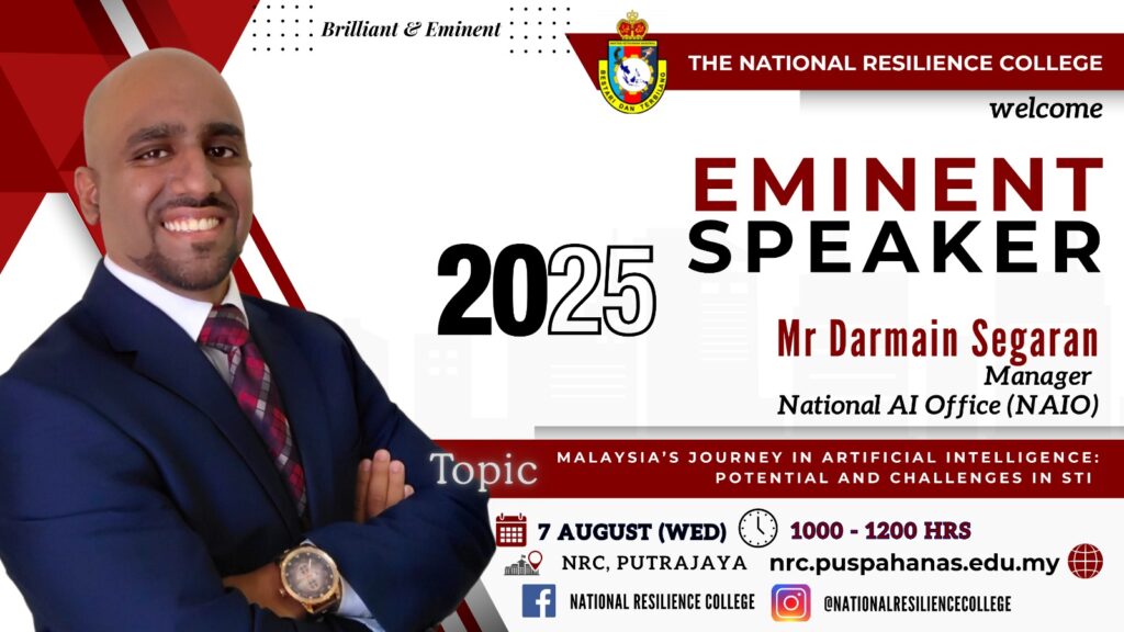 The National Resilience College (NRC) hosted Mr. Darmain Segaran, Manager of the National AI Office (NAIO), as an Eminent Speaker. Delivering a session titled “Malaysia’s Journey in Artificial Intelligence: Potential and Challenges in Science, Technology and Innovation (STI),” he highlighted Malaysia’s progress in AI adoption, the opportunities it presents for national development, and the pressing […]
