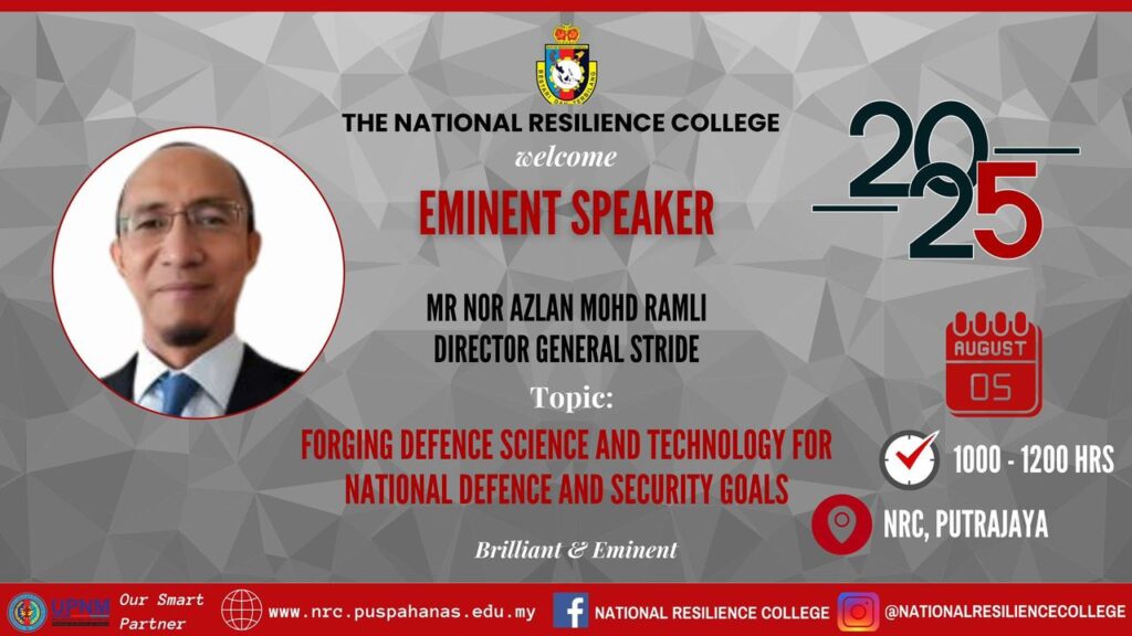 The National Resilience College (NRC) was privileged to host Mr. Nor Azlan Mohd Ramli, Director General of STRIDE, as an Eminent Speaker on “Forging Defence Science and Technology for National Defence and Security Goals.” His address underscored the critical role of defence science and technology in strengthening Malaysia’s security landscape, from advancing innovation to ensuring […]