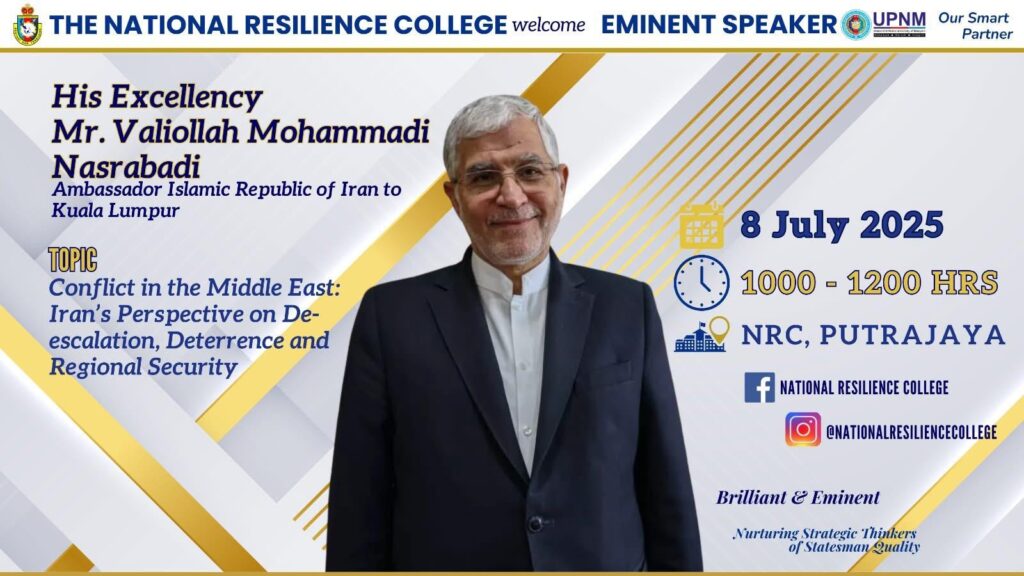 The National Resilience College (NRC) had the honour of hosting His Excellency Mr. Valiollah Mohammadi Nasrabadi, Ambassador of the Islamic Republic of Iran to Kuala Lumpur, as an Eminent Speaker on “Conflict in the Middle East: Iran’s Perspective on De-escalation, Deterrence and Regional Security.” The session provided invaluable insights into Iran’s strategic outlook on regional […]