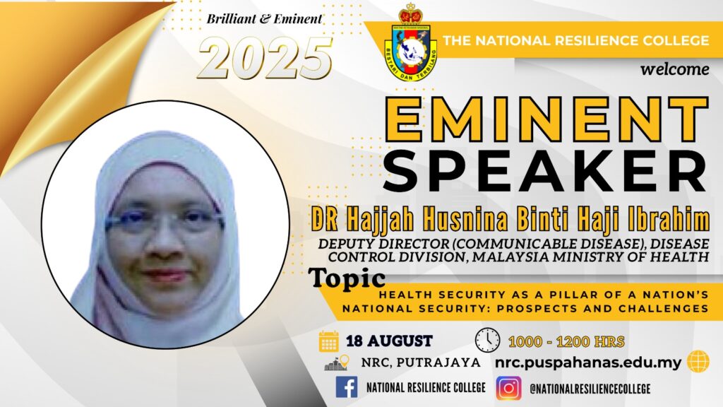 The National Resilience College welcomed Dr. Hajjah Husnina Binti Haji Ibrahim, Deputy Director (Communicable Disease), Disease Control Division, Ministry of Health Malaysia, as the Eminent Speaker. She delivered an insightful lecture on “Health Security as a Pillar of a Nation’s National Security: Prospects and Challenges”, stressing the vital link between public health and national resilience. […]