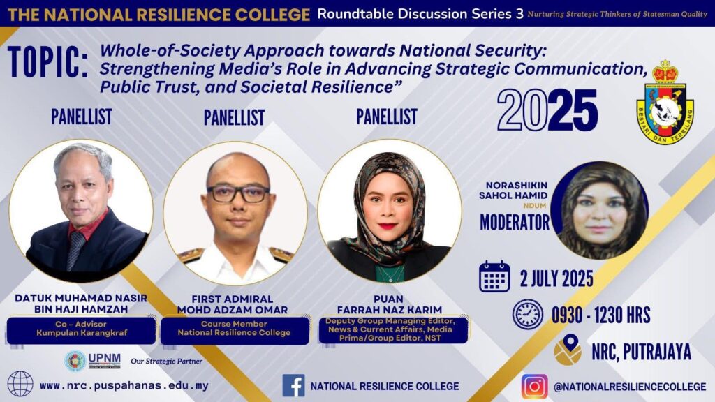 The National Resilience College today convened another high-impact Roundtable Discussion featuring Datuk Muhamad Nasir bin Haji Hamzah (Co-Advisor, Kumpulan Karangkraf), First Admiral Mohd Adzam Omar (Course Member, NRC) and Puan Farrah Naz Karim (Deputy Group Managing Editor, Media Prima / Group Editor, New Straits Times), with Norashikin Sahol Hamid of the National Defence University of […]