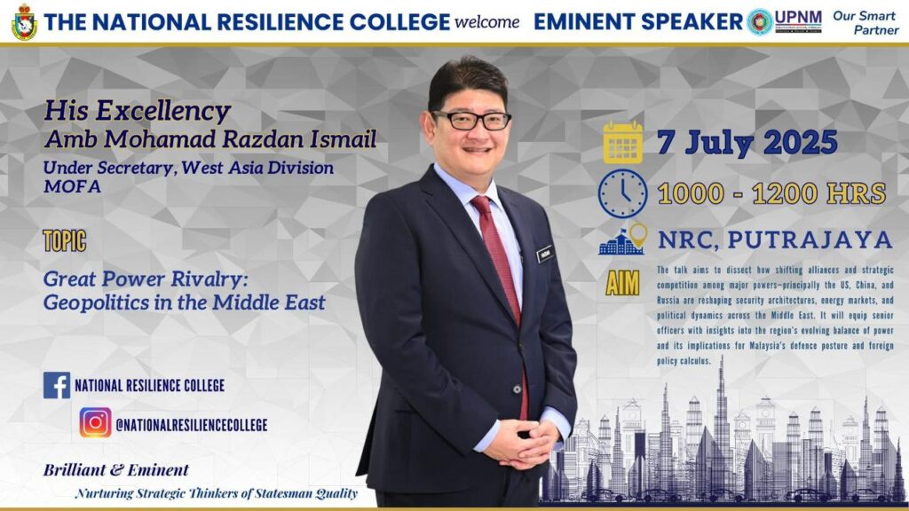 The National Resilience College (NRC) was honoured to welcome His Excellency Ambassador Mohamad Razdan Ismail, Under Secretary of the West Asia Division, Ministry of Foreign Affairs, as our Eminent Speaker on the timely and critical topic “Great Power Rivalry: Geopolitics in the Middle East.” The session will provide invaluable insights into how shifting alliances and […]