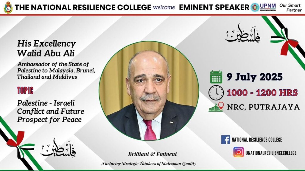 The National Resilience College (NRC) was honoured to host His Excellency Walid Abu Ali, Ambassador of the State of Palestine to Malaysia, Brunei, Thailand, and the Maldives, as our Eminent Speaker on “Palestine-Israeli Conflict and Future Prospect for Peace.” This timely session provides an important platform to understand one of the world’s longest-standing conflicts, its […]