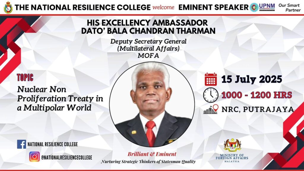 The National Resilience College (NRC) was honoured to host His Excellency Ambassador Dato’ Bala Chandran Tharman, Deputy Secretary General (Multilateral Affairs), Ministry of Foreign Affairs Malaysia, as our Eminent Speaker on the topic “Nuclear Non-Proliferation Treaty in a Multipolar World.” This timely discussion shed light on the growing complexities of nuclear security amid shifting global […]