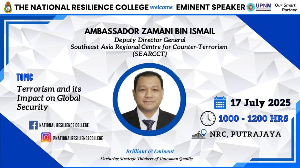 The National Resilience College (NRC) was privileged to host Ambassador Zamani bin Ismail, Deputy Director General of the Southeast Asia Regional Centre for Counter-Terrorism (SEARCCT), as our Eminent Speaker on the topic “Terrorism and its Impact on Global Security.” This critical discussion highlighted how terrorism remains one of the most pressing threats to international peace […]