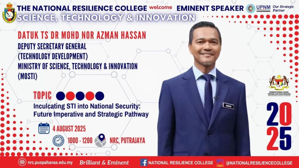 The National Resilience College (NRC) was honoured to host Datuk Ts. Dr. Mohd Nor Azman Hassan, Deputy Secretary General (Technology Development), Ministry of Science, Technology & Innovation (MOSTI), as our Eminent Speaker on the topic “Inculcating Science, Technology and Innovation (STI) into National Security: Future Imperative and Strategic Pathway.” This critical session underscored the pivotal […]