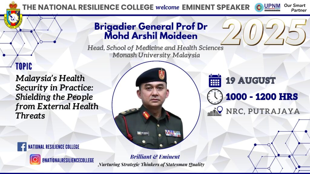 The National Resilience College recently welcomed Brigadier General Prof Dr Mohd Arshil Moideen, Head of the School of Medicine and Health Sciences at Monash University Malaysia, as an Eminent Speaker, where he delivered an insightful lecture on “Malaysia’s Health Security in Practice: Shielding the People from External Health Threats.” Held on 19 August 2025 at […]
