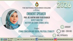 On 15 January 2026, the National Resilience College continued its Foundation Week programme by welcoming Prof. Dr Kartini Aboo Talib @ Khalid, Deputy Director of the Institute of Ethnic Studies (KITA), as an Eminent Speaker to address “Ethnic Cohesion and Social Political Stability.” Drawing on Malaysia’s lived experience as a plural society, the session emphasised that cohesion was not a soft agenda but a strategic asset, shaping public trust, institutional legitimacy, and the nation’s ability to manage differences without escalation. By linking identity dynamics, social stability, and governance outcomes, the lecture reinforced why sustaining inter-ethnic understanding and inclusive civic resilience remained essential to national security, crisis management, and long-term development.